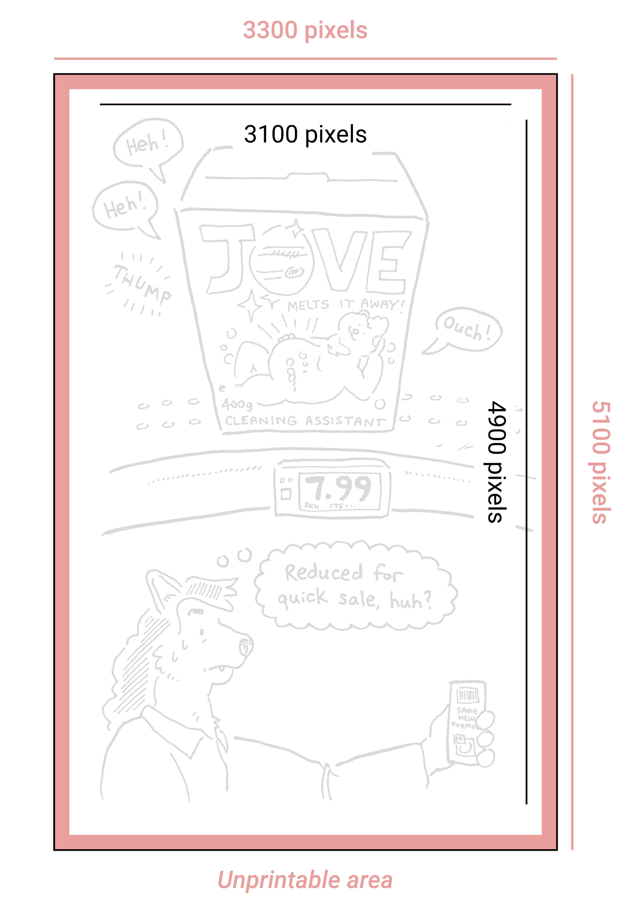 Except in unusual cases, all Furry Sex Comics zines will be printed in a half-letter format. That means 5.5" x 8.5", which means (at 600 dpi) 3300 by 5100 pixels. Subtract 100 pixels of unprintable area around every edge and that leaves you 3100 by 4900 pixels to work with.