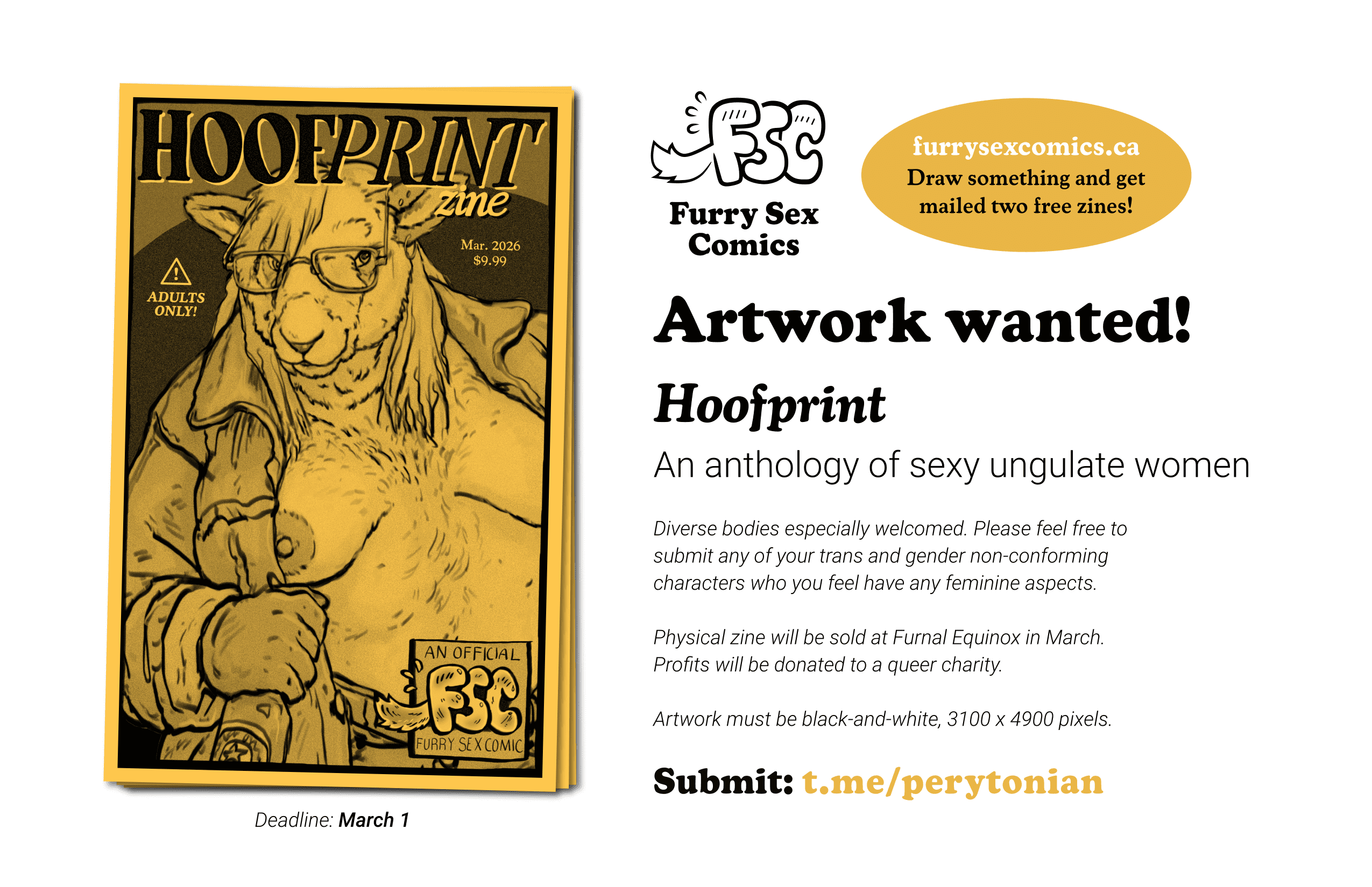 Wanted: 3100 x 4900 pixel black-and-white drawings that fit the theme. Body diversity especially welcomed. (Yes, I am PERSONALLY a fatfur, but furry porn beauty standards are quite narrow and there are many awesome ways to break outside of them.)